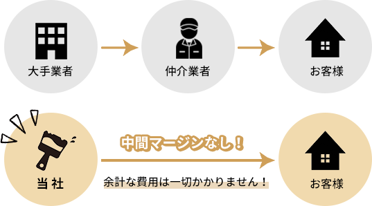 お客様に安心してご依頼いただけるよう、仲介業者を介さず、自社施工にこだわっています。大手企業のように営業会社や下請け業者を経由しないため、余計な中間マージンが発生しません。そのため、施工費用のみの適正価格で、高品質な施工を実現しています。